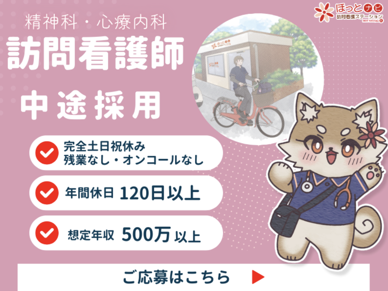 アピールポイント: ≫≫≫ここがPOINT≪≪≪ ✨ 1日の訪問件数が少なくてもお給料変動なし(固定給保証) ✨ 歩合制ではない為、利用者様にじっくりと寄り添えます ✨ 訪問看護未経験者でも活躍可能!! ✨ 会社として産休・育休の取得を推進し、男性の取得実績も増えています。 ✨有給の当日取得可! 「子どもが急に熱を出してしまった…」など、そんな時もご安心を! 有給の当日申請・取得が可能!1時間単位から取得ができます。 子育てしながら働くスタッフも多いので、周りからの理解も得られる環境です。 【ほっとナビで一緒に働くメリット】 ほっとナビでは、利用者様だけでなく、一緒に働く皆様を大切にし、 医療福祉者としての価値向上を目指しています。 1. 充実した教育環境 ✨教育部を完備 精神科訪問看護を学びたい方が、じっくりと学べる環境を整えています。 ✨講義や勉強会の開催 福祉事業所向けの講義や勉強会を定期的に開催しており、講義スキルも学べます。 2. アウトリーチ支援の学びと実践 ✨実際の支援を通じた学び アウトリーチ支援の現場で、支援方法や連携についてしっかり学べます。 ✨利益に関わらず支援を継続 利益を優先せず、目の前で困っている方々と共に考え、解決まで関わる支援を実践しています。 ✨アウトリーチに興味がある方大歓迎! 3. キャリアの幅が広がる職場 ✨訪問看護以外の経験も積める 新規事業の立案から実行まで、一貫して学ぶ機会があります。 ✨経営について学べる 将来独立を考えている方には、事業計画の立て方や融資の知識など、経営に関するノウハウを学べます。 ✨独立支援制度あり 独立を目指す方を応援します! 依存しない関わり方と自立に向けた伴走型応援隊として利用者様寄り添っています!