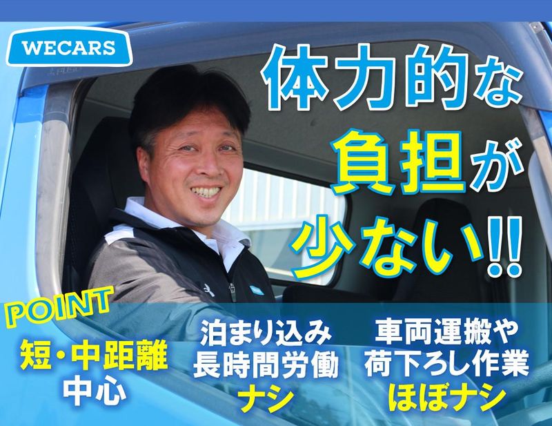 仕事内容 □■ この求人のPOINT ■□ 伊藤忠グループ/24年5月設立 ◎短・中距離がメイン! (移動距離:100km圏内が中心) ◎毎日帰宅できる (泊まり込み・長時間労働なし) ◎無理のないスケジュール (事務所が運行管理を担当) ◎体力的な負担が少ない (中型積載車での車両運搬/ 荷下ろし作業ほぼなし) ◎未経験からはじめられる! (トラックドライバー経験不問) ◎ブランクのある経験者も歓迎! ◎研修制度あり (先輩社員の同行でしっかり学べる) ◎原則定時退社! □■ お任せする仕事は ■□ <運転するのは中型積載車> 職場の近場で事故にあった クルマを引き取り、運搬します。 <仕事の流れ> 100km圏内を中心に1日2~3件。 泊まり込みなし。 残業がある場合でも、1日1時間程度です。 一般のお客様から事故発生の連絡。 ▼ 勤務地のWECARS店舗から 積載車に乗って現地へ。 ▼ ◎事故車が運転できる程度の破損の場合 → エンジンをかけて車両を 積載車の荷台に載せ、店舗併設の工場へ。 ◎クルマが大破などで動かせない場合 → 2名で現地に向かい、 ウインチで引き上げて積み込み。 ▼ 鈑金塗装スタッフ(修理担当)に引き継ぎ。 ▼ クルマが元通りの姿になると、 再び積載車に載せてお客様のお宅へ配送。 ▼ 愛車が無事戻ったお客様に 感謝をいただけることもやりがいです。 ※1日あたりの件数は事故件数などにより 変動する場合があります。 ※店舗間でクルマを配送する業務も あります。 □■ 感謝の言葉を直接いただける ■□ 事故やトラブルで困っているお客様のもとへ 一番に駆けつける仕事です。 安心したお客様から感謝の言葉をいただく 機会が多く、やりがいを実感できます。 □■ 時間に追われない仕事 ■□ 運行スケジュールは、 時間に追われることがないように 事務所のスタッフが管理。 無理のないスケジュールで運行できます。 □■ 未経験者からはじめられる ■□ ◎ドライバー未経験でも興味がある方、 運転業務のブランクがある方も歓迎です。 ◎お客様とのやりとりについても マニュアルを整えているので、 スムーズに仕事をはじめられます。 ◎入社後、先輩のクルマに同乗する研修で 仕事の流れを丁寧に指導します。 □■もしもの備えもばっちり ■□ 積載車をぶつけてしまったり、 事故を起こしたりしても大丈夫。 保険加入など万全のサポート体制があるので 安心して業務に取り組めます。 □■ 将来について■□ 鈑金塗装、整備士などを 目指すことも可能です。 運搬・配送の仕事がない日は 店舗併設の鈑金工場で、 洗車や塗装のサポートを通じて 技術を学ぶことができます。 ==== 私たちはこんな会社です ==== □■ WECARSって? ■□ 私たちは、伊藤忠グループ参画の下、 2024年5月に発足した 中古車販売・買取企業。 現在、 全国で約250店舗を展開しています。 □■ WECARSが大切にしていること ■□ 1. お客様ファースト (お客様の満足度・納得感の向上) 2. お客様ファーストを実現するための 組織・社員としての成長 3. 信頼される中古車市場の創造をリード □■ 評価について ■□ 2025年1月に人事制度を改定。 がんばりを正当に評価できる 仕組みを導入しました。 以下のようなポイントを 評価の軸としています。 ◎お客様評価・お客様満足度の向上 ◎チームワーク・店舗評価 ◎コンプライアンスの遵守 あなたがやりがいを持って働けるよう、 教育制度や評価制度、働き方の改革を どんどん進めています。 ★人事制度改革、 人材育成への取組強化、 コンプライアンス体制構築等の 改革を推進しています。