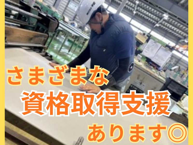 仕事内容 \創業100年以上の老舗メーカー/ 日勤のみ×正社員=安定しています◎ ~未経験OK・資格取得支援あり~ ✨……………………………………✨ 創業100年超の老舗メーカーで、未経験からキャリアアップしませんか? 会社負担での資格取得があり、スキルを磨きながら長く働ける環境です! <扱う製品> 住宅・学校・工場などに使われる金属屋根・外壁材を自社工場で製造しています。 建物によりサイズや形が違うため、高い板金加工知識や技術が身に付きます◎ <仕事内容> ✅材料のセット 天井クレーンを使用し、指定の色や厚みのトイレットペーパー状の鉄板を機械にセットします。 ✅成型機の操作 注文内容に合った成型機を使用し、操作盤でボタンを操作しながら鋼板を指定の形とサイズに成型していきます。 簡単なボタン操作なので、機械オペレーターなどの経験がなくても心配無用! ✅出来上がりの検査・梱包 成型機から出来上がった製品に異常がないか確認し、専用の梱包機で梱包したら出荷置場へ移動させます。 ✅出荷 完成した製品を天井クレーンやフォークリフトを使用し、自社のトラックへ積込みます。 ✅配送(該当免許保持者のみ) 自社トラックにて、お客様より指定された納期・納入先へ配送します。 天井クレーンやフォークリフトでの製品移動は、資格取得後にお任せする業務になります。 まずは補助業務から開始!OJTで先輩が丁寧にサポートするので安心です◎ ひとつずつ扱える機械や工程が増えるごとに、やりがいや面白味も増すと思います! <1日の流れ(例)> 08:15 ラジオ体操(任意) 08:20 朝礼 08:25 打合せ 08:30 作業開始(2〜3名のチーム制) 10:00 小休憩を取り、作業再開 12:00 昼休憩(マイカーで気ままに過ごしたり外食もOK♪自由に過ごせます✨休憩ができる個室もあります) 15:00 小休憩を取り、作業再開 17:30 清掃・終業準備 18:00 終業。お疲れ様でした♪ <社員インタビュー> 入社動機や働き易さ、やりがいを聞いてみました! 【勤続4年/36歳男性】 知識や経験が無くてもできる簡単な作業から始められ、少しずつ経験を積んだり資格を取得したりすることで、工場内のさまざまな加工機を使えるようになり、自分のスキルアップにやりがいを感じられます。 【勤続3年/42歳男性】 地元で働きたいと思っており、「交代勤務がないこと」「転勤がないこと」が入社の決め手でした。 工場内では製造ラインが違っても、忙しい時にはお互い助け合いながら生産を行っており、とても雰囲気のよい職場だと思います。 集中できる環境なので、仕事をしていると時間の経過が早く、あっという間に終業時間となることが多いです。 【勤続4年/44歳:女性】 以前勤めていた会社のオフィスワークでは人間関係に気を揉む場面がありましたが、工場作業は生産に集中する環境なので余計な気遣いをせず、仕事にまっすぐ向き合えるのが心地良いです。 力を合わせて一緒にものづくりをしている感覚が強く、人間関係もさっぱりしていて働きやすいです✨ 【勤続5年/50歳男性】 前職では拘束される労働時間が長く家庭と仕事の両立ができなかったんですが、当社では残業時間をしっかり管理しワークライフバランスが取れた生活ができるようになりました。 水曜日は会社がノー残業デーを推奨しており、皆で無駄な残業をしないよう取り組んでいます。 【勤続3年/40歳男性】 工場や住宅に金属屋根や壁が使われているのを見たとき、そこに自分たちの工場で生産された製品や材料が使われていると思うと、やりがいを感じます。 また、休日でも自然とあの家はどんな屋根を使っているのか気になって目がいってしまいます。 ◆-◆ ✨未経験者への受け入れに自信あり ベテランスタッフが基本から教えるので、専門知識や経験がなくても、働きながら技術を習得できます! ✨会社負担で手に職をつけられる 業務に必要な資格は、会社が費用を全額負担! <こんな資格が取得できます> ▶天井クレーン・玉掛け・フォークリフト、etc… ▶普通免許AT限定解除(MT化) 将来のキャリアに活きる、クレーン・デリック(国家資格)/施工系資格/一級施工管理技士のチャレンジも応援! ✨キャリアステップ 現場で活躍を続けたい方もOKですし、リーダーや作業長、工場長などへのポジションUPも可能。 新工場稼働に伴い、役割のチャンスが増えていきます◎ 希望をお気軽にご相談ください! ✨ワークライフバランス抜群 日勤のみ+土日祝休み+年間休日114日で、プライベートを大切にしながら働けます。 腰を据えて長く働きたい方にもぴったり◎ ✨給与UP施策 2026年末までに入社された方は、2030年までに会社全体で12.8%の給与UPが決定しています。※会社施策(3年継続予定)。